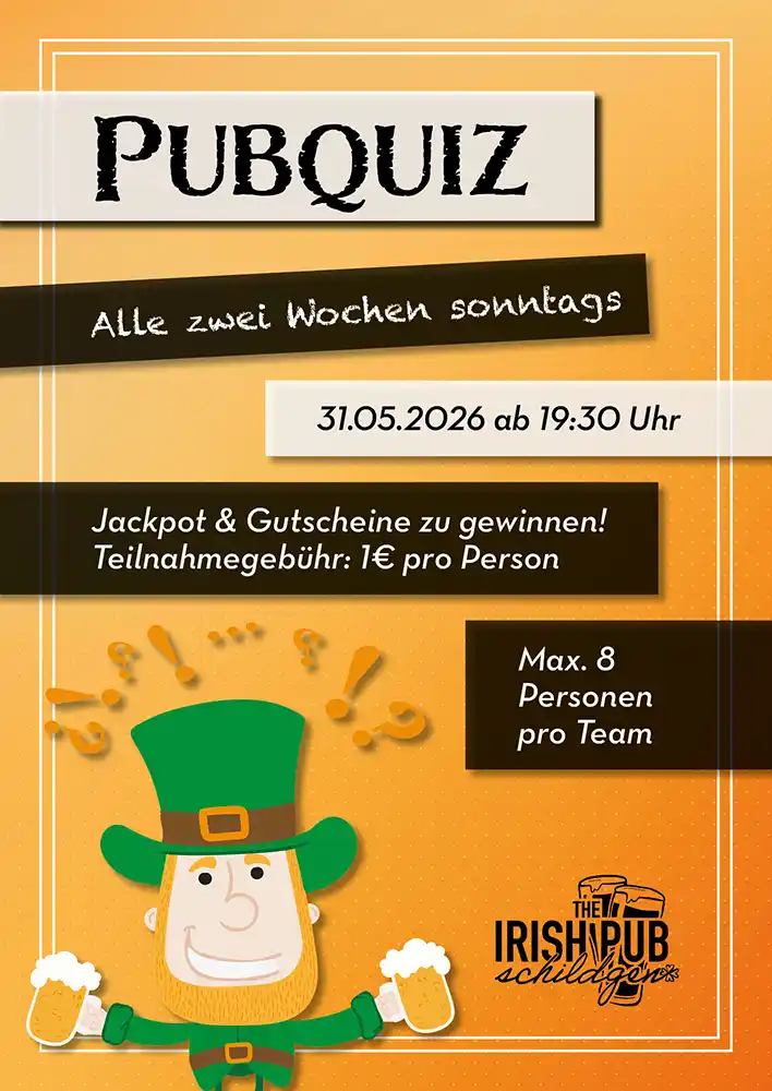 Das Pubquiz hat in Irland Tradition und findet dort in vielen Pubs statt. Auch bei uns im Irish Pub Schildgen gibt es seit vielen Jahren ein sehr beliebtes Pubquiz. Alle zwei Wochen Sonntags treffen sich um 19:30 Uhr Quizfreunde aus der Umgebung und bringen zum Ausklang des Wochenendes ihre Köpfe bei abwechslungsreichen Fragerunden zum Rauchen.
